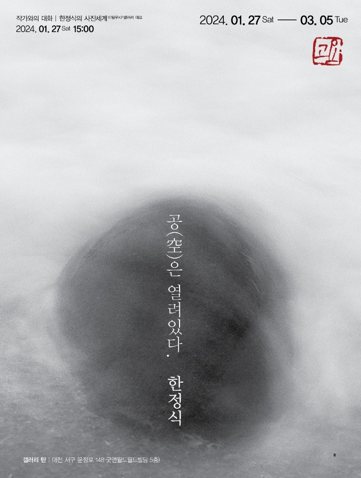 한정식 사진가의 "공(空)은 열려있다" 전시가 대전 탄 갤러리에서 새로운 작품들과 함께 1월 27일부터 3월 5일까지 진행됩니다. 작년 유작전에 이어 대전에서 개최되는 이번 전시에 많은 관심 부탁드립니다. 갤러리 탄 윤광빈대표님 감사합니다.